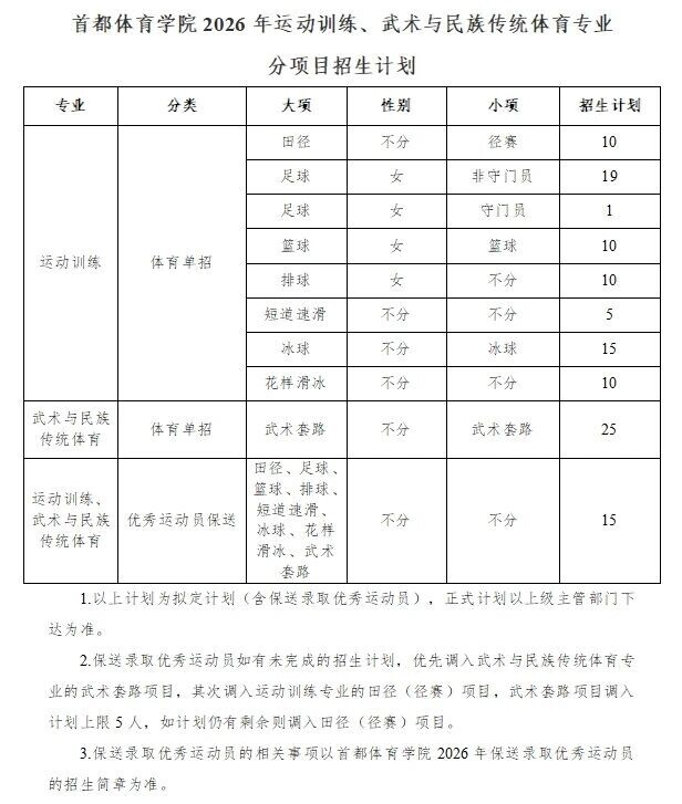 (一)首都体育学院是普通公办高校,学校层次为本科、研究生。运动训练、武术与民族传统体育专业是国家计划内的全日制本科专业,学制4年,面向全国招生,不列分省计划。