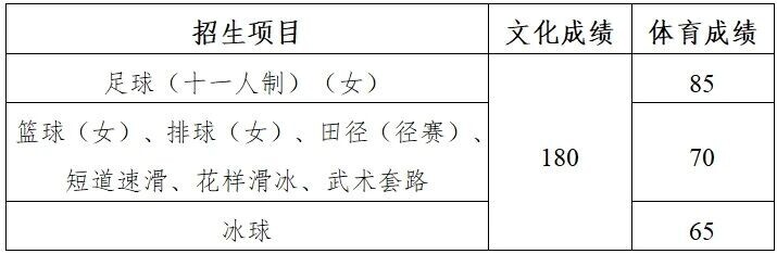 (五)计划调整规则:我校未完成的招生计划将按照顺序依次调整至足球(十一人制)(女)、冰球、武术套路、篮球(女)、排球(女)、短道速滑、田径(径赛)、花样滑冰,按照综合分由高到低排序,综合分相同时,依次比较体育专项成绩、文化成绩、语文成绩、数学成绩、政治成绩、英语成绩,录取成绩高者,足球不再区分小项。依据上述计划调整规则,若出现通过计划调整录取的二志愿考生其综合分等于或低于该项目一志愿录取的最低综合分的情况,计划将调整至下一个项目,直至没有可被调入计划的项目为止。